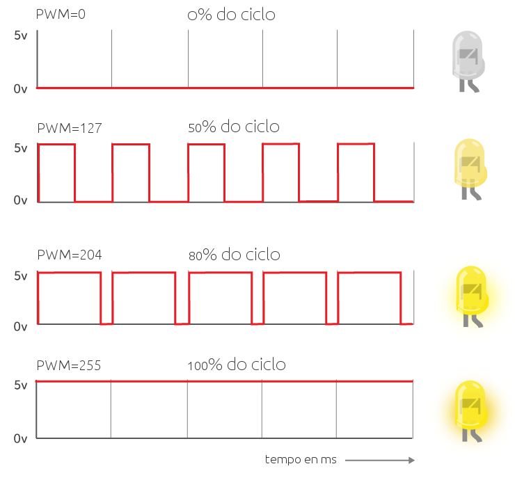 Por exemplo, se temos un LED conectado a un pin dixital PWM e enviamos un sinal PWM de valor 0 o LED estará apagado, se enviamos un valor de 255 estará aceso completamente e se enviamos un valor de 127 brillará a metade do que brillará no caso anterior, pois só enviamos 5V na metade do ciclo útil.
