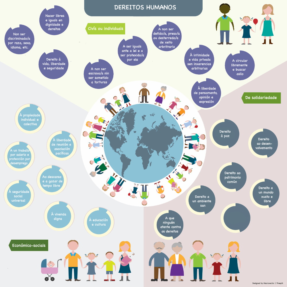 a) En grupo, propoñede un artigo máis para completar a seguinte infografía sobre os dereitos humanos recollidos na Declaración Universal (acceso directo).