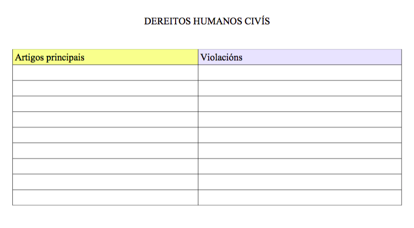 c) Trasladade a información da infografía referente aos dereitos civís a un cadro como o seguinte, incorporando tamén as formas xerais de violación.