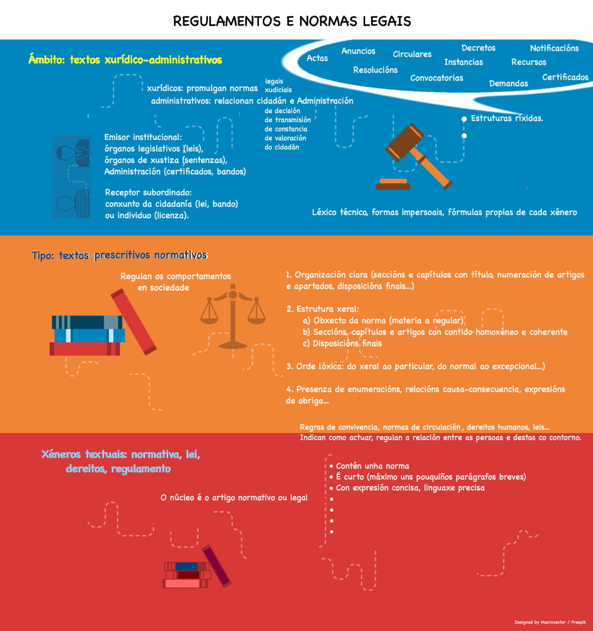 Xa apreciamos previamente os trazos xerais do noso xénero textual e somos conscientes do contexto no que se emprega. Sistematizamos, entón, agora as súas características. Ademais da Declaración Universal dos Dereitos das Persoas, podemos fixarnos no regulamento dun IES ou en ordes, decretos e leis.