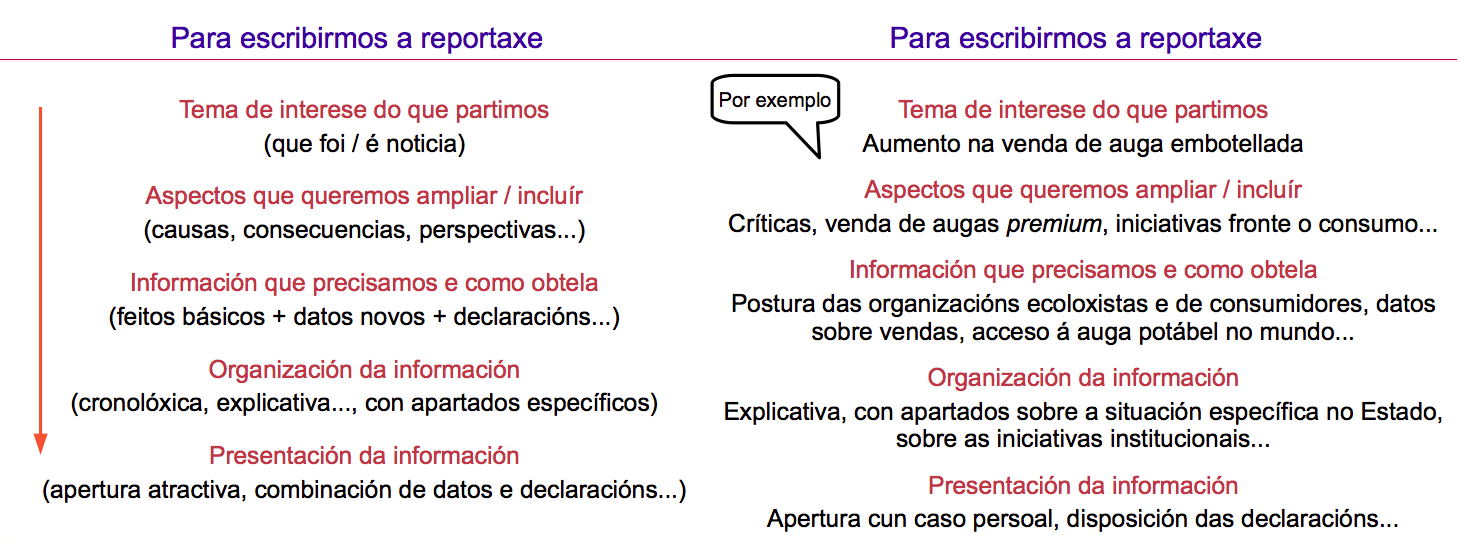 Para confeccionar o borrador da reportaxe escrita, atenderemos as notas da planificación, combinaremos os datos dos que dispomos e aplicaremos os recursos para organizar, captar a atención, citar e expresar opinión. Así: