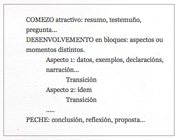 - Ordenamos a información e opinións recolleitas. Desbotamos o repetido e organizamos as ideas clave nun esquema con distintos apartados e posíbeis parágrafos.