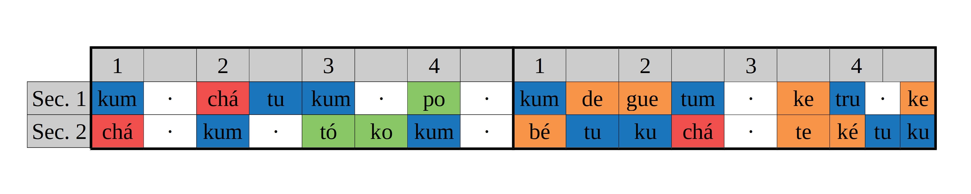 - Si observas la definición de secuencia complementaria en la sección de definiciones verás que los gestos iguales nunca coinciden en el tiempo entre las 2 secuencias. Esto lo verás muy claro si pones colores a las sílabas: