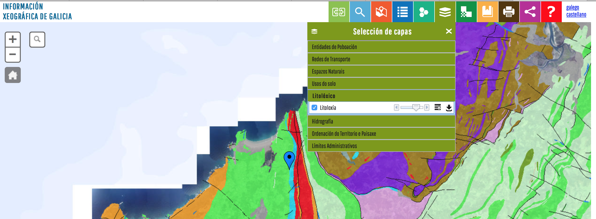 Se é posible realiza esta exercicio de visita a esta páxina web coa axuda do profesor/a de Ciencias Naturais. Unha vez apuntadas as diferentes formacións incluídas na nosa paisaxe (sobre todo interésanos coñecer moi ben aquelas que atravesa a nosa ruta); situaremos no noso visor diferentes marcas de posición co nome das formacións existentes na nosa zona de estudio. Imos poñer especial atención nos materiais que conforman as formas de relevo identificadas no apartado anterior (cantís, praia, illas, etc.). Para isto, te será moi útil, axudarte da cobertura WMS da litoloxía (consulta na axuda)