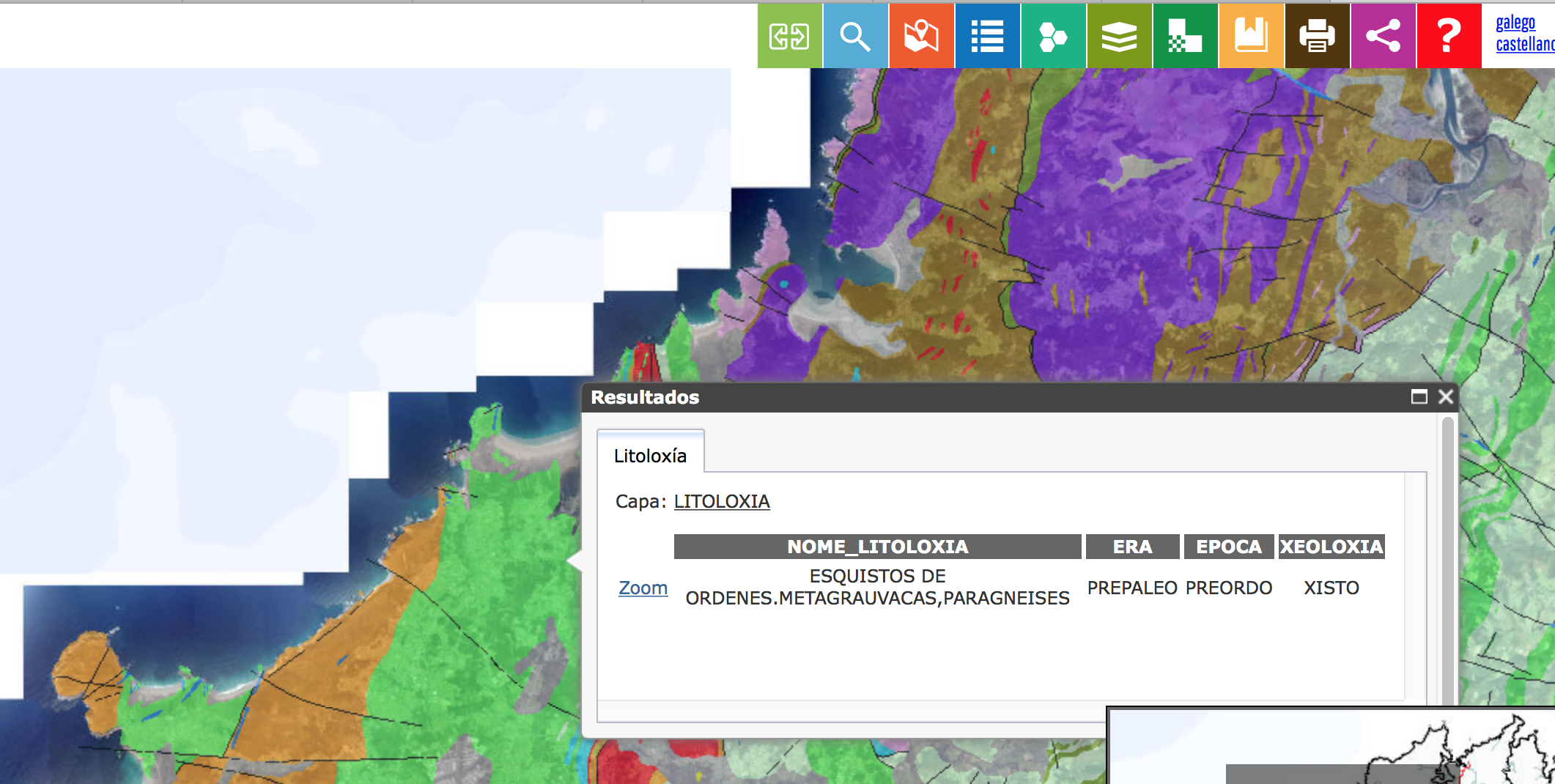 Unha vez activada a cobertura, poderedes “picar” co cursor do rato en cada formación para coñecer cal é o seu nome e a súa xénese. Recolle esta información para poder empregala posteriormente no noso visor.