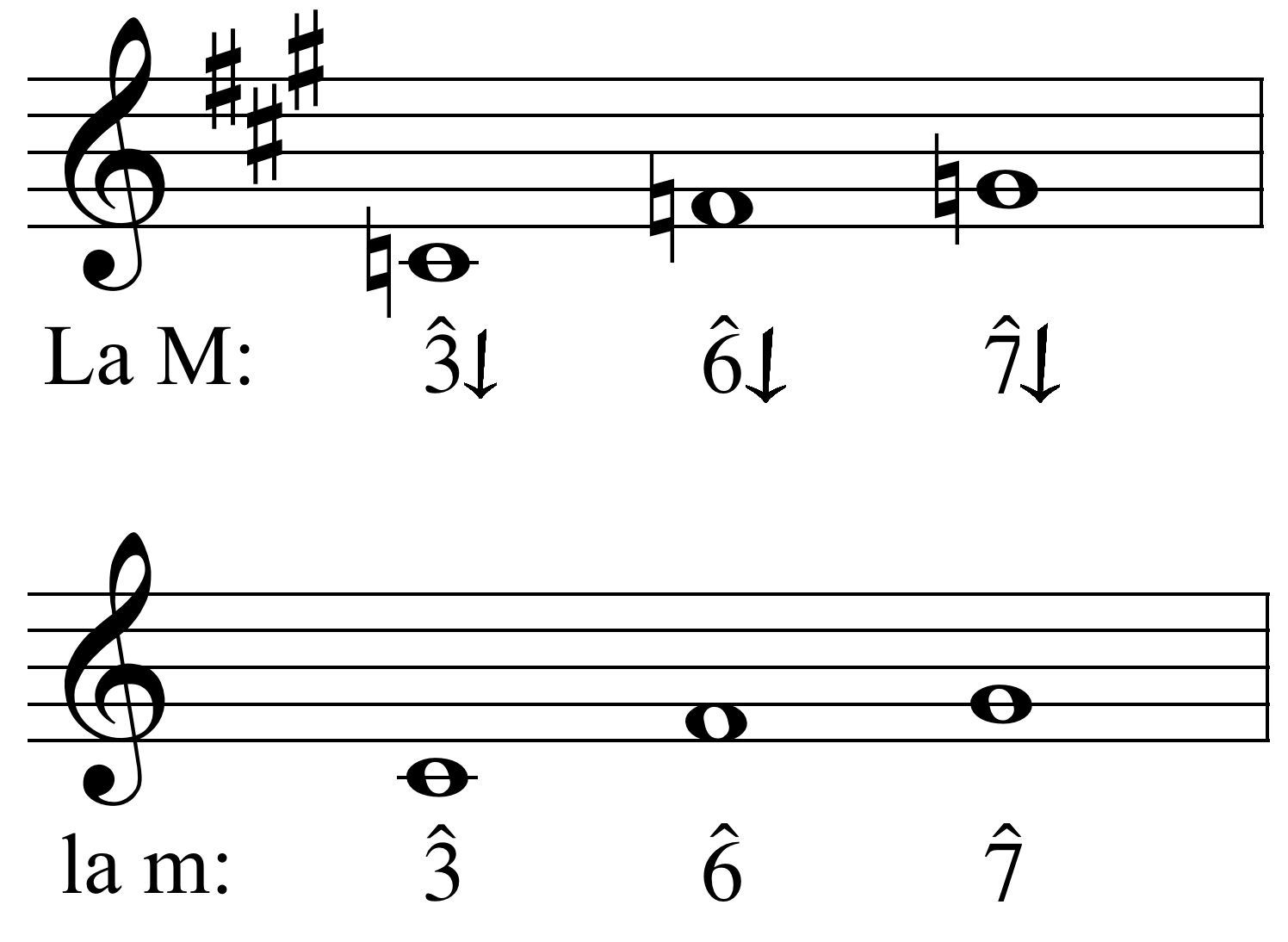 Dado que os sons empregados son rebaixados con respecto a armadura, cifraremos os sons individuais prestados do modo menor con frechas cara abaixo.