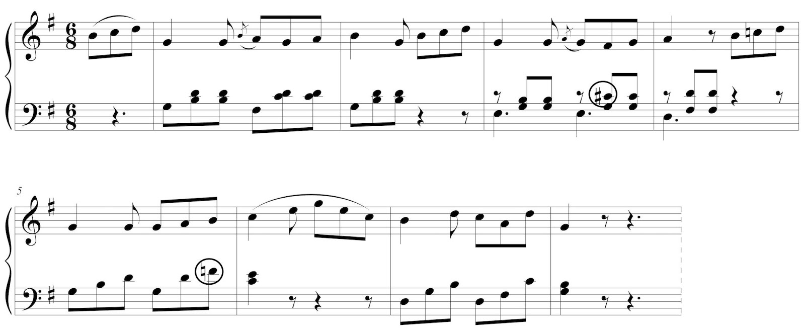 O do♯ do compás 3 e o fa♮ do compás 5 non pertencen á armadura de Sol maior, e neste caso forman acordes que son dominantes secundarias, a primeira é dominante da dominante e a segunda dominante do IV grao, que é unha subdominante.