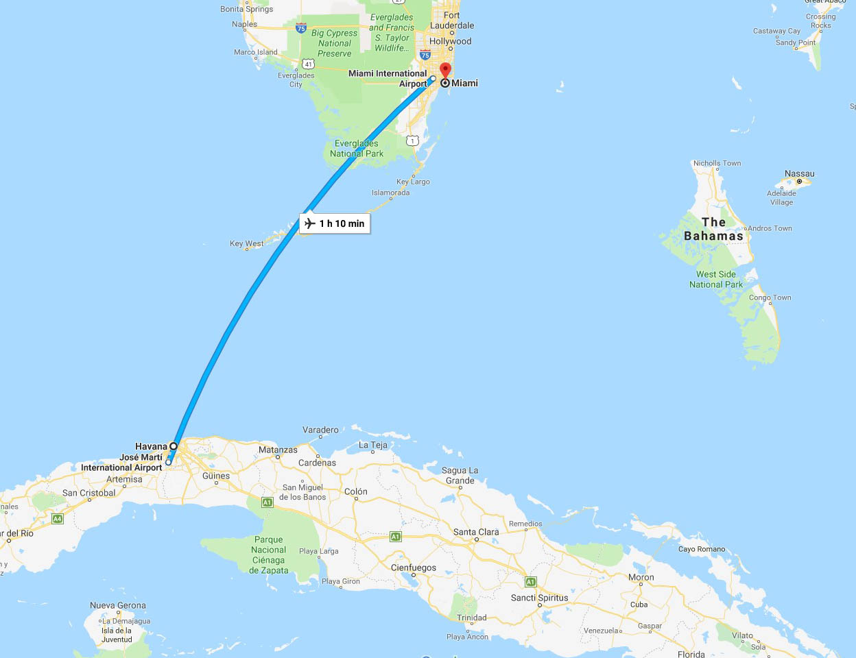 Miami is only 367 kilometres away from Havana. It takes one hour 10 minutes to get there by plane.