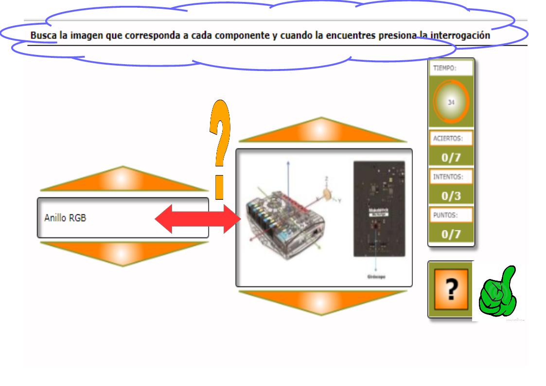 Con esta actividad comprobarás si sabes todos los nombres de los componentes del robot. Se muestran una serie de imágenes y tienes que emparejarlo con el nombre que corresponda. Cuando lo encuentres presiona la interrogación.