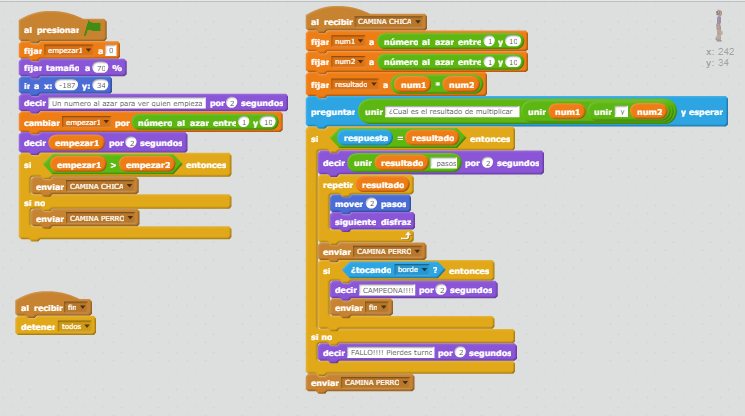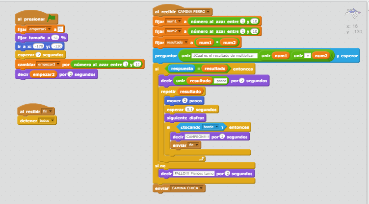 Este reto es una modificación del de Paseo Matemático. Es una carrera entre dos objetos. En primer lugar se resuelve quien va a comenzar a jugar con un numero al azar. El numero mayor comienza a jugar y para avanzar tiene que realizar una multiplicación.