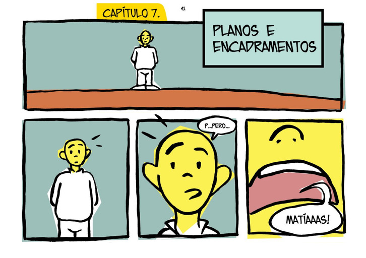 | C. Comentade oralmente no grupo as seguintes cuestións: -Cal é a historia que contan estas viñetas? -A forma das viñetas ten algo de especial? Con que finalidade? -Que planos e encadres se usan e que se pretende con cada un deles? -Os globos non teñen texto. Con que elementos se narra entón a historia? -O personaxe está debuxado con moito detalle ou só con trazos esenciais? |