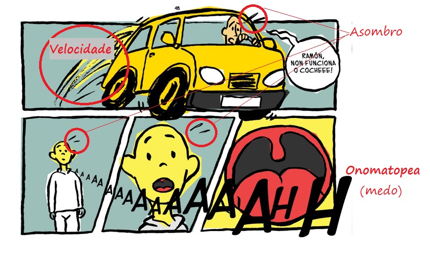 D. Para finalizar, debuxade individualmente unha cuarta viñeta. Unha vez feitas, comentádeas no grupo. Explicade que elementos propios da banda deseñada usastes e con que finalidade. |