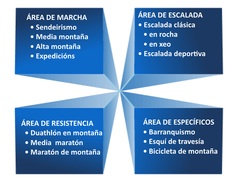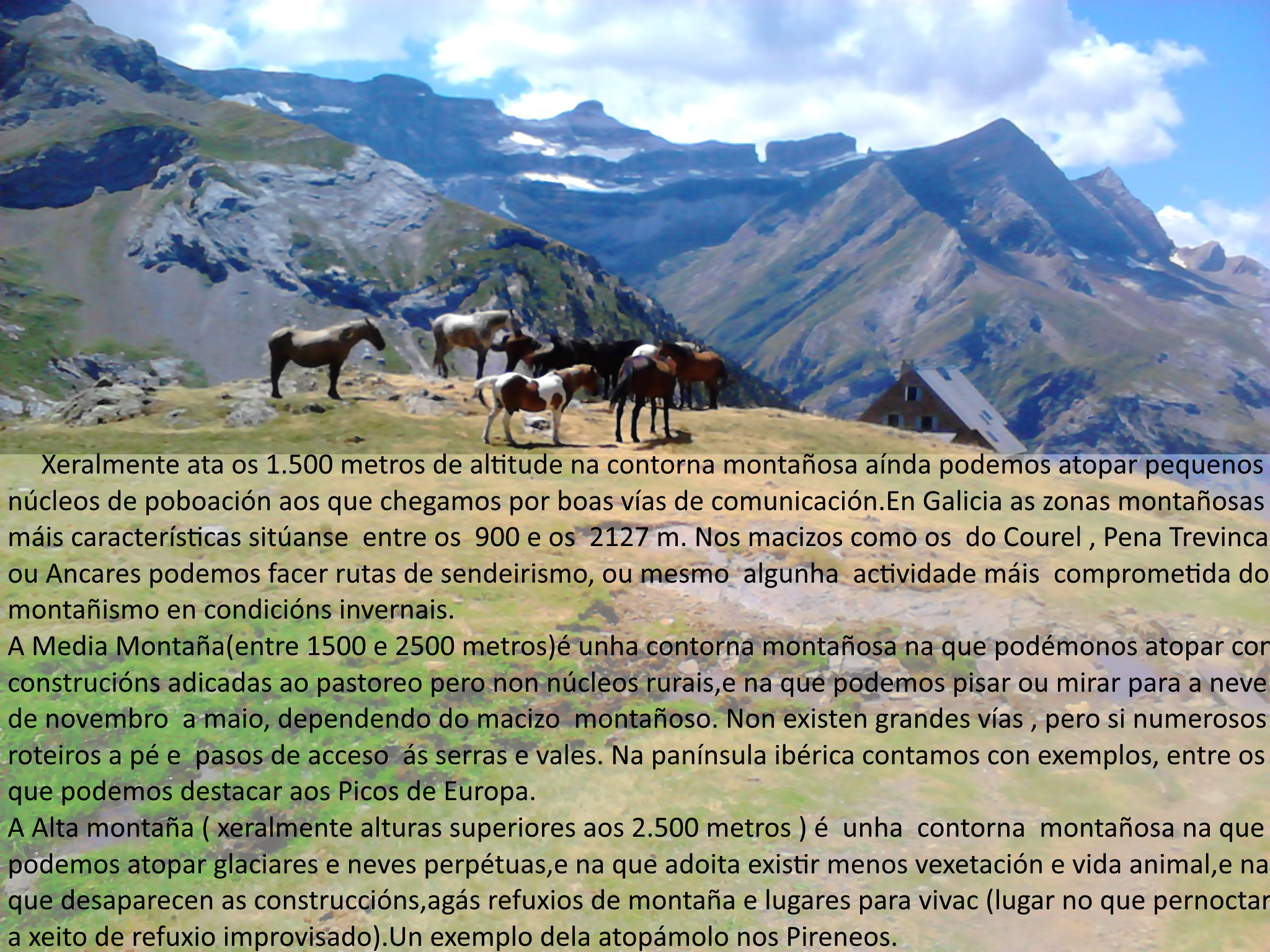 En Galicia as zonas montañosas máis características sitúanse entre os 900 e os 2127 metros.Nos macizos como os do , Pena Trevinca ou podemos facer rutas de , ou mesmo algunha actividade máis comprometida do montañismo en condicións invernais.