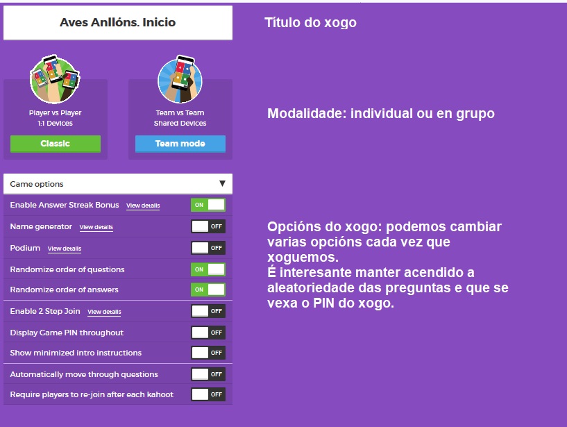En primeiro lugar eliximos as opcións inferiores e posteriormente pinchamos sobre o xogo individual ou en equipos. Unha vez completada esta pantalla a aplicación proporciónanos un número PIN que os alumnos deberán introducir nos seus dispositivos.
