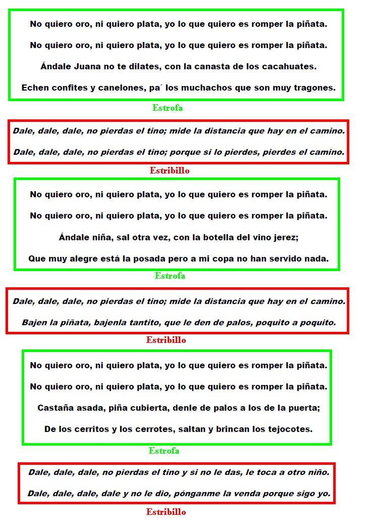 Se nos fixamos na letra, poderiamos falar dun rondó, xa que temos un estribillo (o 2/4) que se mantén igual durante a canción, e varias estrofas (o 6/8), que van contando a historia da piñata.