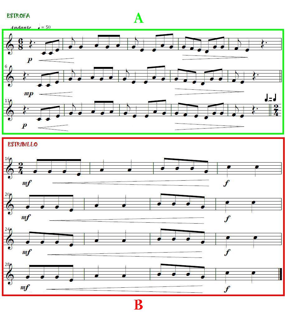 Neste caso, a canción ten dúas partes diferenciadas en canto á música, marcada polo compás: a parte co 6/8 e a parte co 2/4; polo tanto, trátase dunha forma binaria.