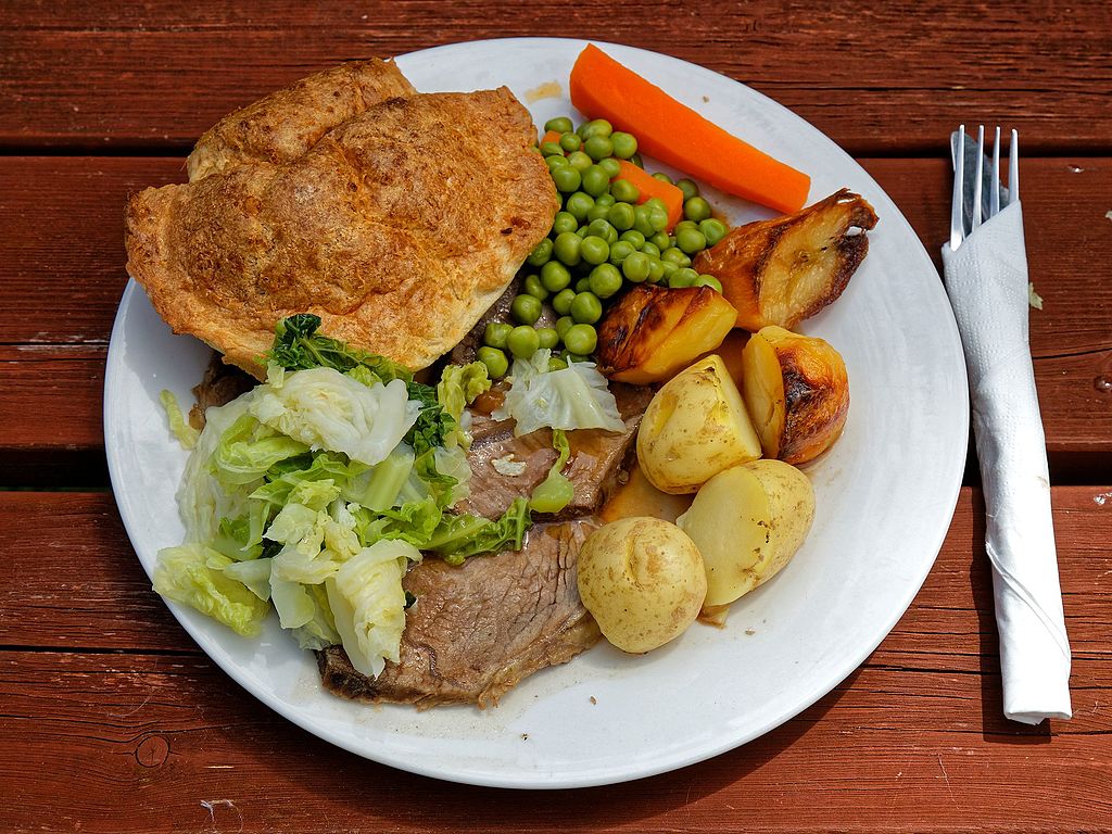 A roast beef dinner. Acabashi. Wikimedia. CC BY-SA / Salmon Appetizer. Petr Kratochvil. PublicDomainPictures. CC0 / Pumpkin Pie Slice. The Culinary Geek. Flickr. CC BY