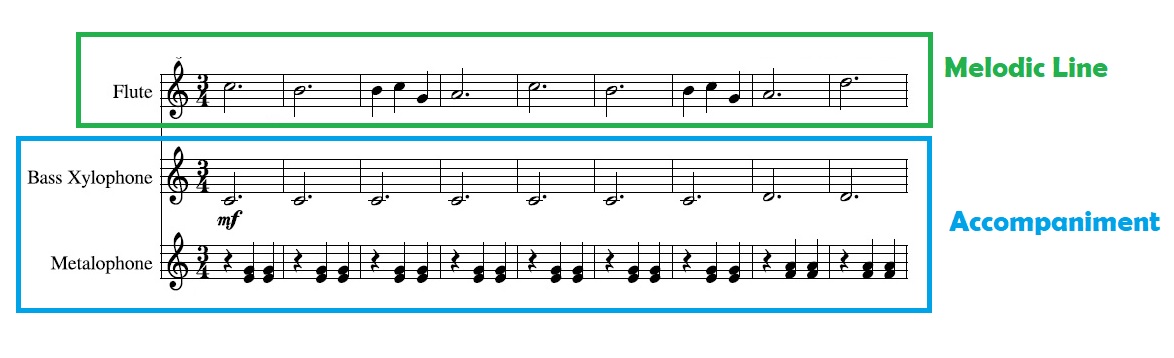 If you pay attention you can see there’s a melody (in flute) and an accompaniment (metalophone and bass sylophone).