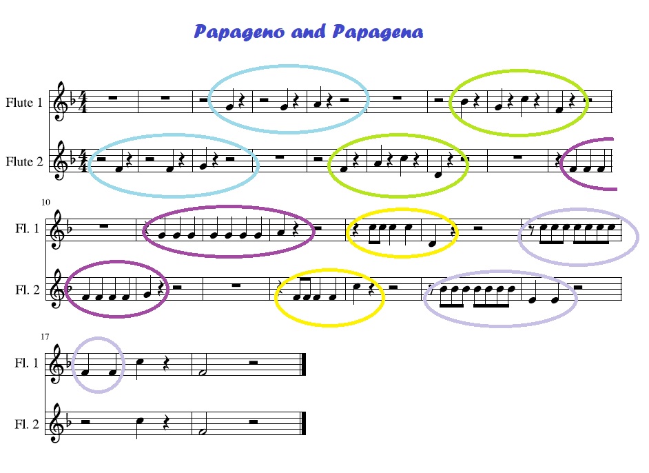 There’s a game between the two characters, Papageno and Papagena (in the score they are flute 1 and flute 2) as if it were a conversation. One presents an idea and the other responds in a similar way.