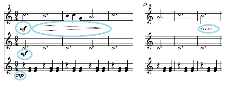 There also appeared some abbreviations: cresc, also referring to intensity. . It means crescendo, so we will have to increase the intensity progressively on those parts.