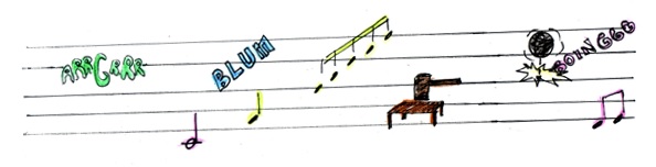 In this video you can see the Stripsody, a piece of music from an American composer and singer, Cathy Berberian, where comic book sounds are used (onomatopoeias).