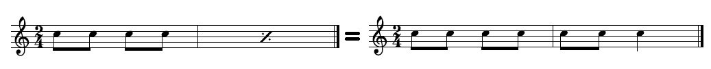It is a sign that is used to indicate that a bar is repeated exactly as many times as in the previous one, the same fragment is repeated. They are the simile marks.