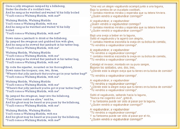 "Waltzing Matilda", literally means “Dancing a waltz with Matilda”, but here "Waltzing", makes reference to the action of a poor person walking (wander) and Matilda, refers to the vagabond.