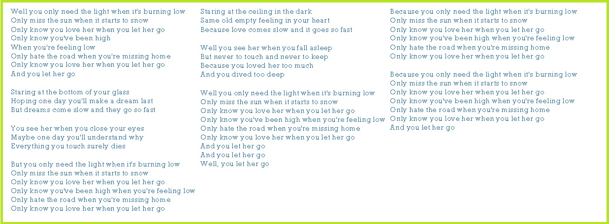 Let her go is a single by the British singer Passenger. It was a success and it sold more than a million digital copies in the UK. It won prizes and it is one of the most adapted pop songs.