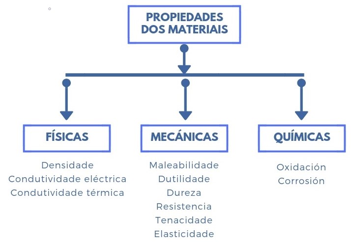 As propiedades dos materiais son o conxunto de características que permiten medir ou predecir como se comporta un material ante estímulos externos. Poden agruparse en tres tipos:
