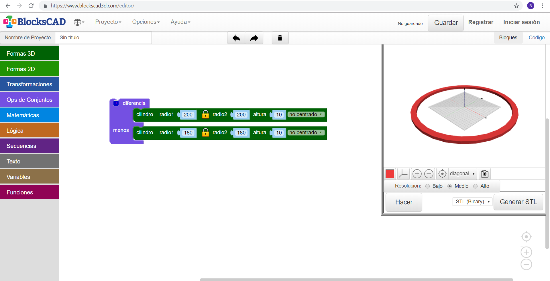 Na barra de bloques, no apartado operacións atópanse diversas instrucións: unión, diferenza, intersección e envoltura convexa. Da combinación dunha delas cunha forma 3D, podemos obter un aro como que se ve na imaxe, cuxas dimensións son: radio externo Fai o deseño desta peza empregando o Blockscad e a continuación completa a seguinte frase: |