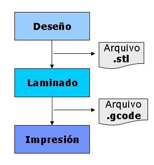 DeseñoMediante o uso dun programa de deseño gráfico, debuxamos a peza que queremos fabricar mediante impresión 3D e gardamos o arquivo en formato .stl. Os programas de deseño máis empregados son SketchUp, OpenSCAD, FreeCAD, etc... ou aplicacións en liña como Tinkercad ou Blockscad3D. Na web podemos atopar tamén, repositorios con multitude de deseños dispoñibles de forma libre que podemos empregar directamente ou modificar para adaptar ás noxas necesidades. Entre eles destacan Thingiverse ou YouMagine. LaminadoNesta etapa empregamos un software que convirte o ficheiro .stl obtido ao formato .gcode que é o que entenden as impresoras. Nesta transformación determínanse as capas de plástico necesarias para conformar a peza deseñada e a orde na que se van suceder. Cura ou Slic3r son dous programas de laminación moi usados. ImpresiónO arquivo .gcode é o empregado pola impresora 3D, podemos copialo nunha tarxeta de memoria ou nun pendrive que se introducen na impresora ou ben traballar co ordenador conectado directamente a ela. As impresoras 3D precisan para funcionar duns parámetros de temperatura e opcións de impresión que xeralmente son aportados polo fabricante, pero que poden ser modificados polo usuario para axustalos ás características da peza. Repetier-Host é unha aplicación freeware que permite controlar a impresión, leva integrados os programas de laminación Cura e Slic3r e permite visualizar, durante a impresión, o trazado e a temperatura do hot-end.