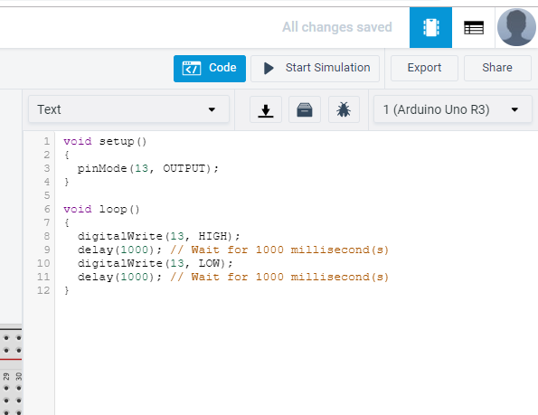 Empezamos facendo a simulación da montaxe que habemos realizar no Tinkercad. Presta atención á forma de conectar o LED, a resistencia e os pins da placa Arduíno: úsase o pin dixital 13 e o GND (terra). Cando remates a montaxe, preme en "Start Simulation" e comproba o seu funcionamento. |