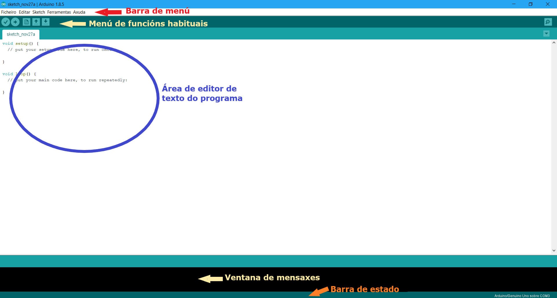 Busca a icona de Arduino no escritorio do teu ordenador e executa o programa. Aparecerá unha ventana como a que se amosa na imaxe, na que podemos diferenciar as seguintes zonas: barra de menú, menú de funcións habituais, área do editor de programa, ventana de mensaxes e barra de estado. O primeiro que debemos facer é comprobar: - que o programa detectou a placa de forma correcta, para o cal na barra de menú accedemos a Ferramentas-->Placa. Debe aparecer escrito ao seu carón "Arduino/Genuino One", pero se non é así seleccionamola na lista despregable. |