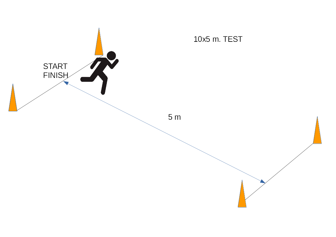 Procedure: marker cones and/or lines are placed five meters apart. Start with a foot at one marker. On the go signal, the student runs to the opposite marker, turns and returns to the starting line. This is repeated five times without stopping (covering 50 meters in total). At each marker both feet must fully cross the line.