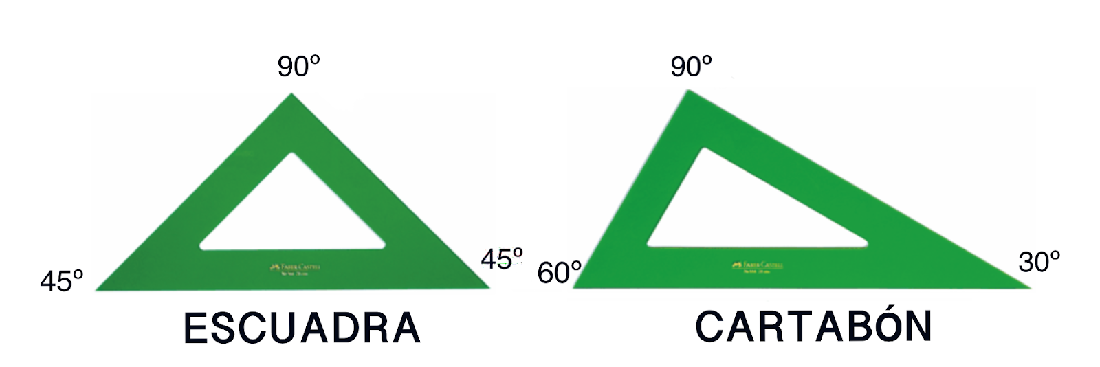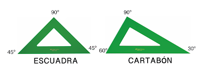 -Xogo de regras: ademais da regra milimetrada temos a escuadra, que é unha plantilla de forma triangular con dous ángulos de 45º e un de 90º, e o cartabón que é unha plantilla de forma triangular con ángulos de 30º, 60º e 90º.