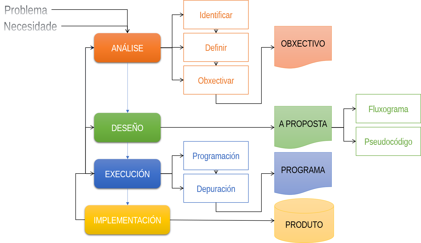 Estamos dentro do proceso de Deseño do noso proxecto de resolución de problemas mediante un produto informático. Xa sabemos e temos claramente definido como obxectivo central o problema ou necesidade de partida. E imos deseñar o noso produto - programa axudándonos dos diagramas de fluxo de datos e do pseudocódigo. Podes ver o proceso completo na imaxe seguinte. (Preme sobre ela para vela en grande)