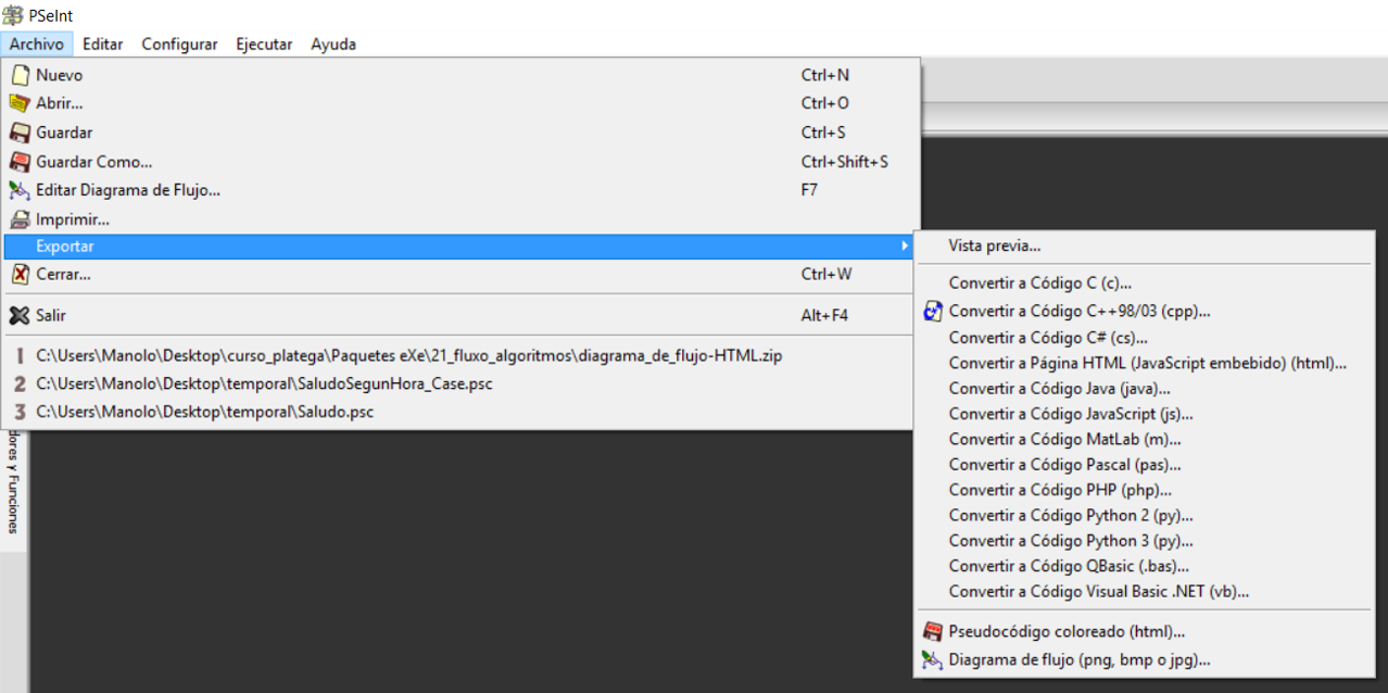 O máis probable é que, se temos o deseño en pseudocódigo correctamente realizado, o paso a unha linguaxe de programación sexa fácil. Concretamente se traballamos coa aplicación PSeint podemos traducir directamente ás diferentes linguaxes, como amosa a seguinte imaxe: (Premer sobre ela para vela en grande)