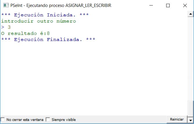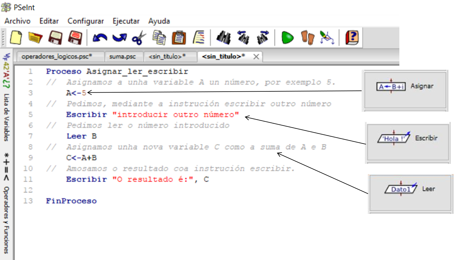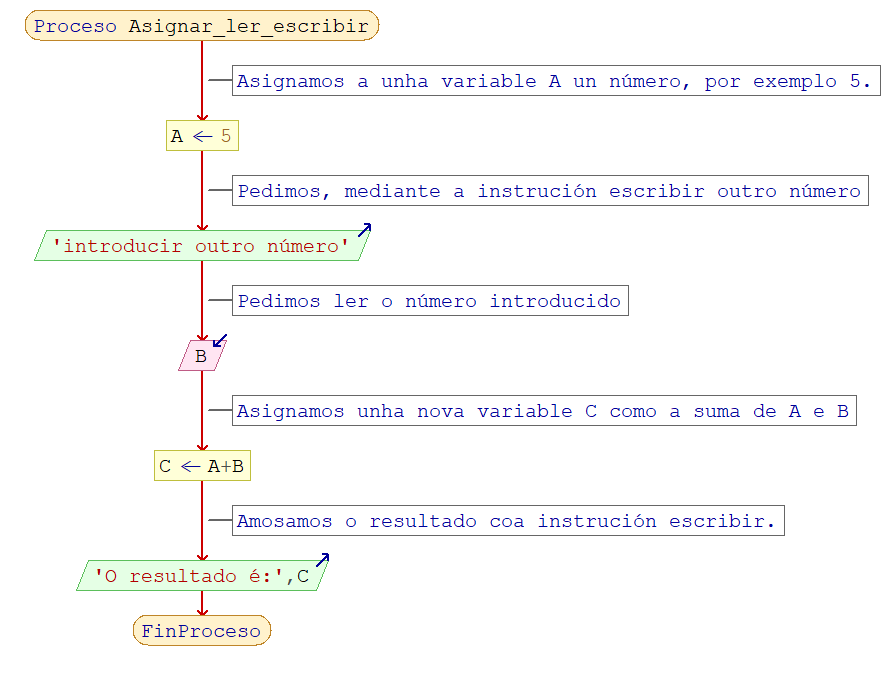 Realizamos de novo un algoritmo da suma de dous números para observar as instrucións asignar, ler e escribir.