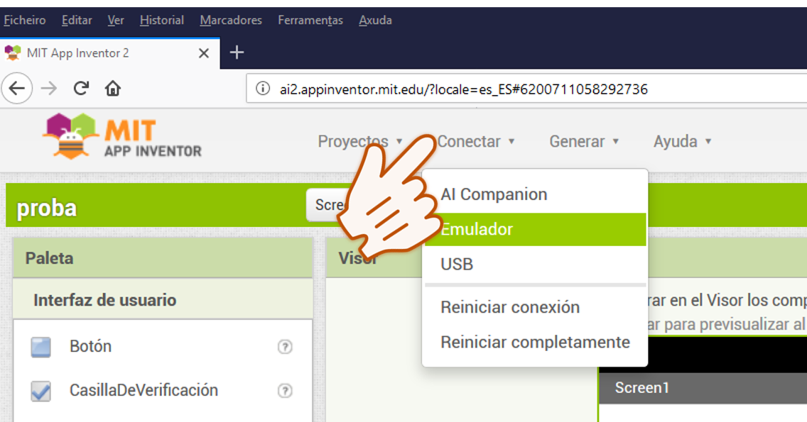 A continuación, dende o menú de App Inventor, vamos ao menú Conectare facemos clic na opción Emulador. (Premer na imaxe para vela máis grande)