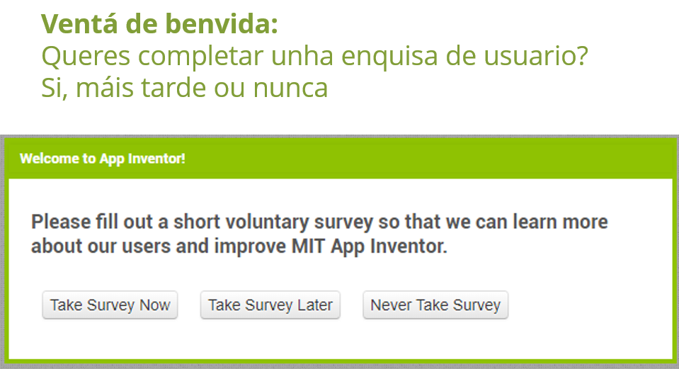 App Inventor 2 non funciona con Internet Explorer. Para os usuarios de Windows, recoméndase usar Chrome ou Firefox como navegador para usar con App Inventor.