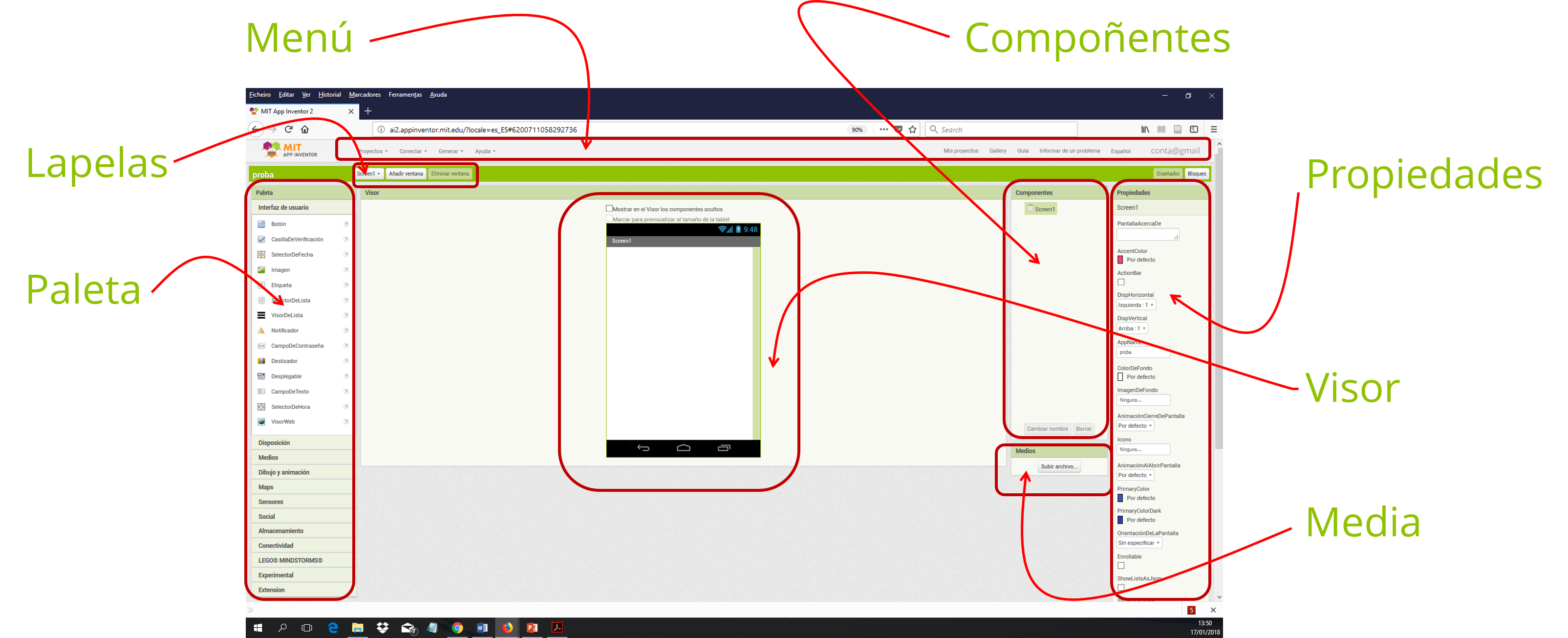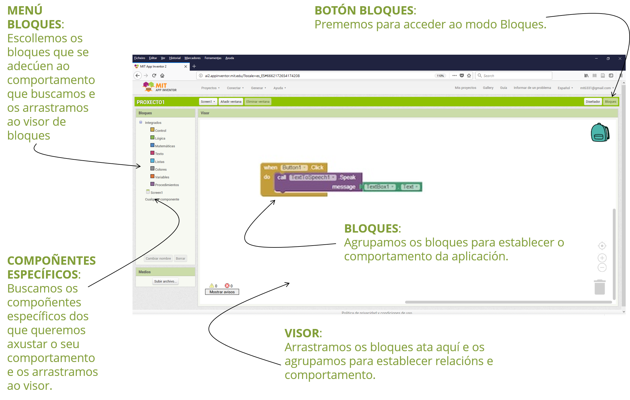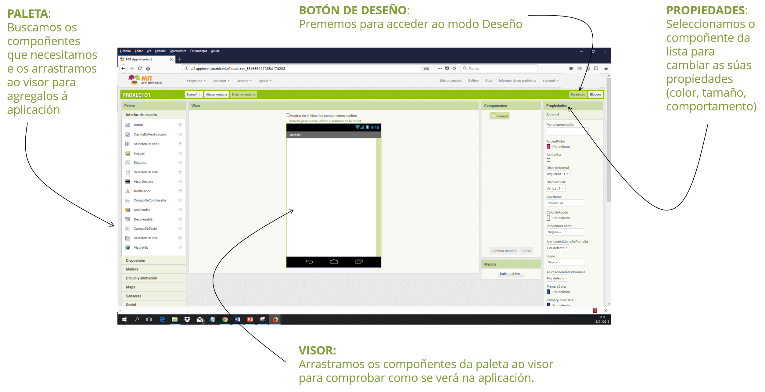 Describimos a continuación de forma gráfica a contorna de traballo de MIT App Inventor2. (premer sobre as imaxes para velas a maior tamaño)