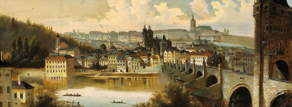 FOTO: Vista de Praga coa Ponte de Carlos cruzando o río Moldava, cadro de Adam August Müller (1811–1844)