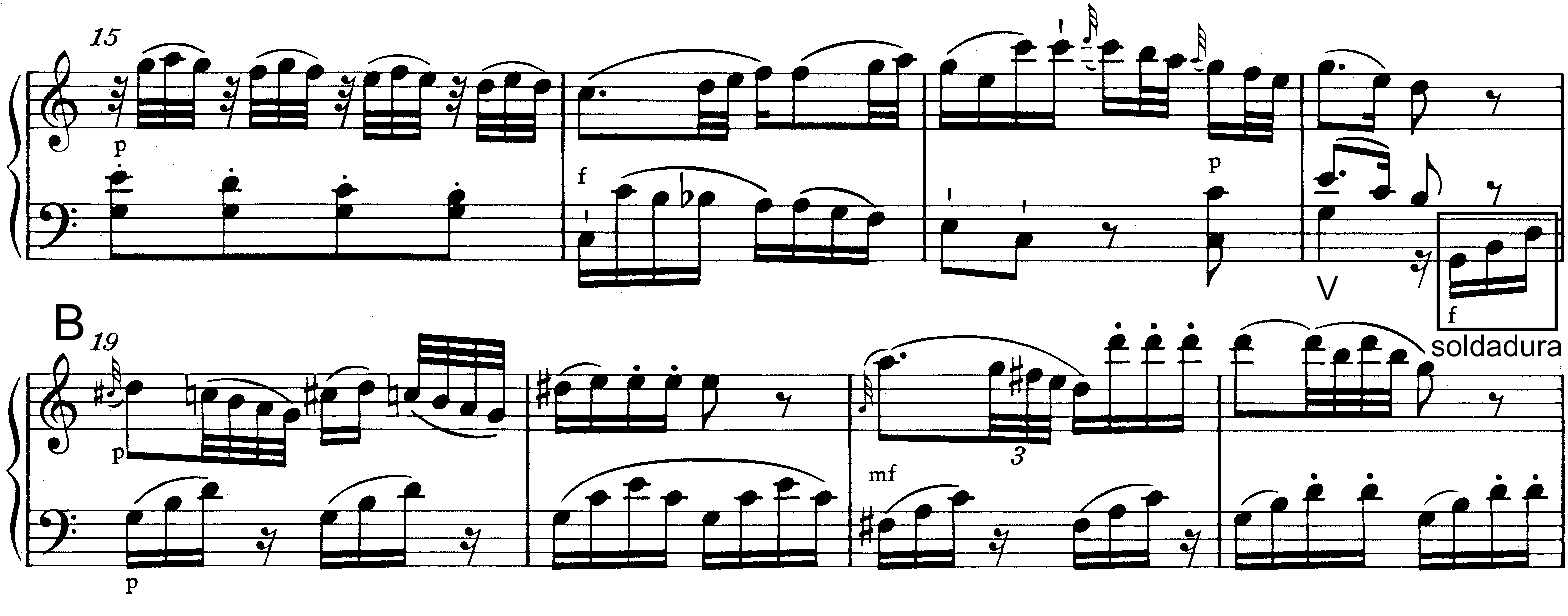 Imaxe 2_2_6b. Soldadura que evita a cesura. W. A. Mozart. Sonata para piano KV 330 (300h): Allegro moderato, cc. 15-22