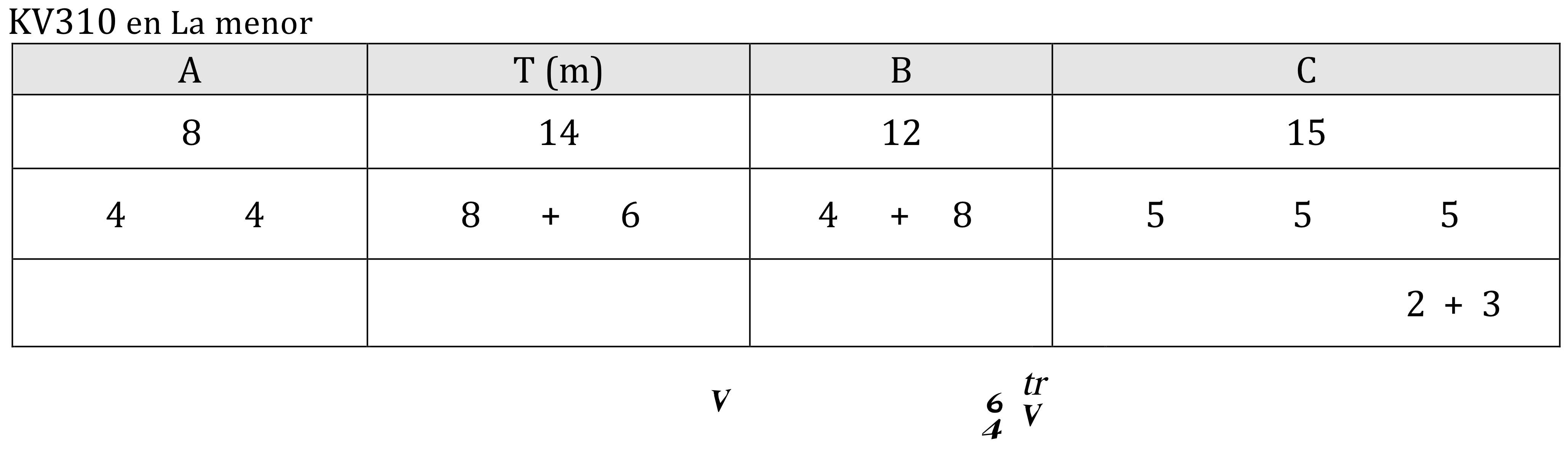 - As estruturas numéricas do período cadencial das sonatas (C), tenden á simetría (4+4, 3+3, 2+2 ou 1+1) e á literalidade na repetición do material. Ademais, neste período, prodúcense moitas veces unha secuenciación de números de maior a menor, creando unha sensación de aceleración a través do fraseo. A organización de C na seguinte sonata (3+3, 2+2) ilustra estas características.