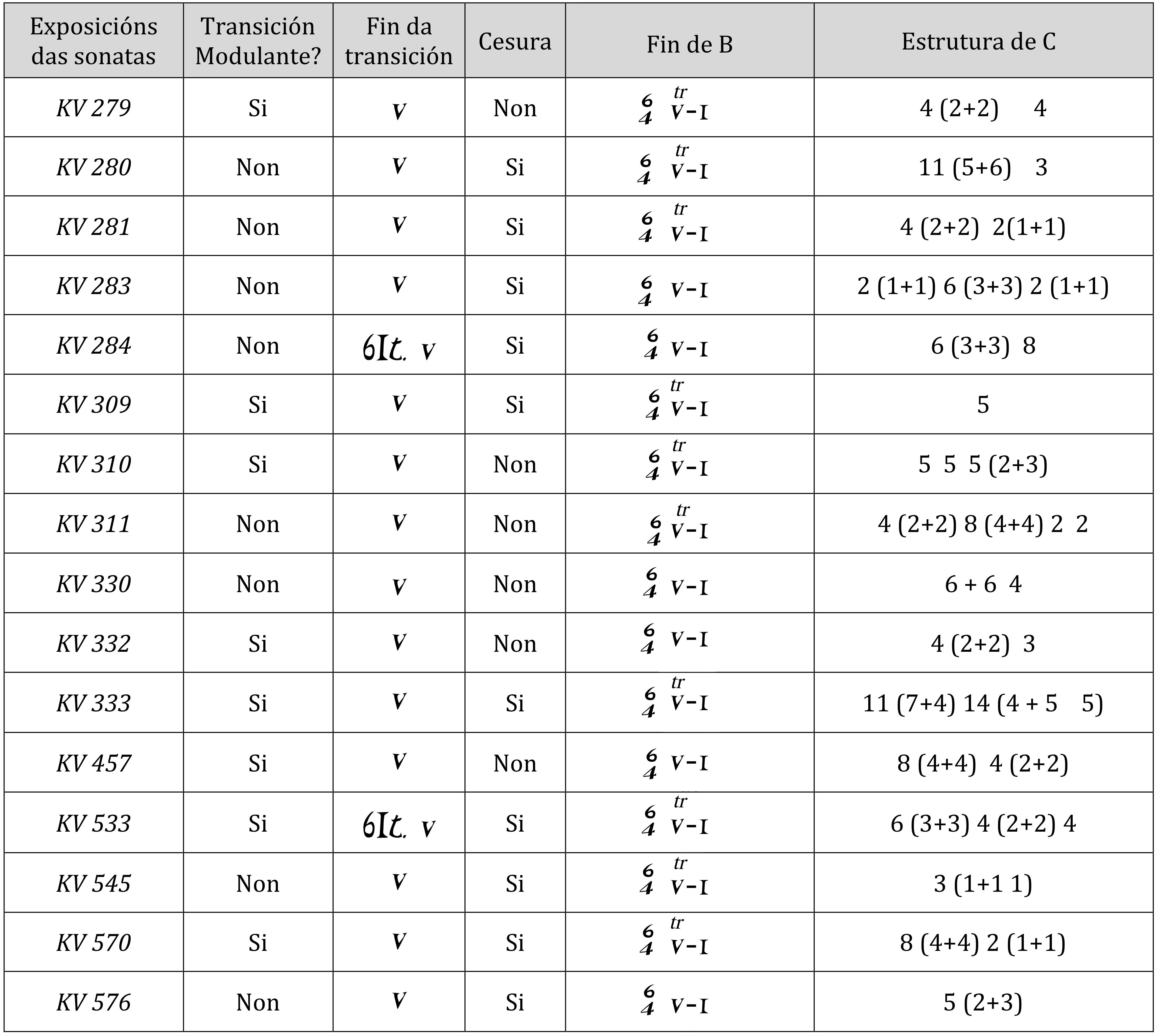 - Todas as transicións (sexan modulantes ou non) rematan cunha semicadencia en forma de tríade de dominante (V). Soamente dúas das sonatas (KV 284 e KV 533) empregan unha 6ª aumentada enlazando co V grado.