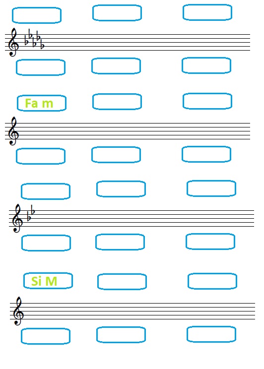 Experimentando coas tonalidades veciñas Duración:00:30Agrupamento:1 ou 2Collemos unha folla pautada e completamos as seguintes armaduras coas tonalidades veciñas. Ánimo!