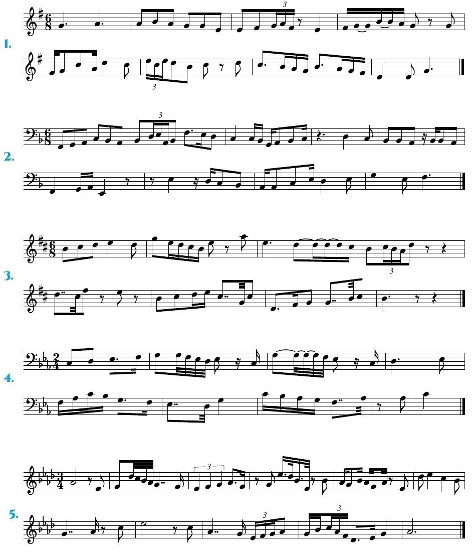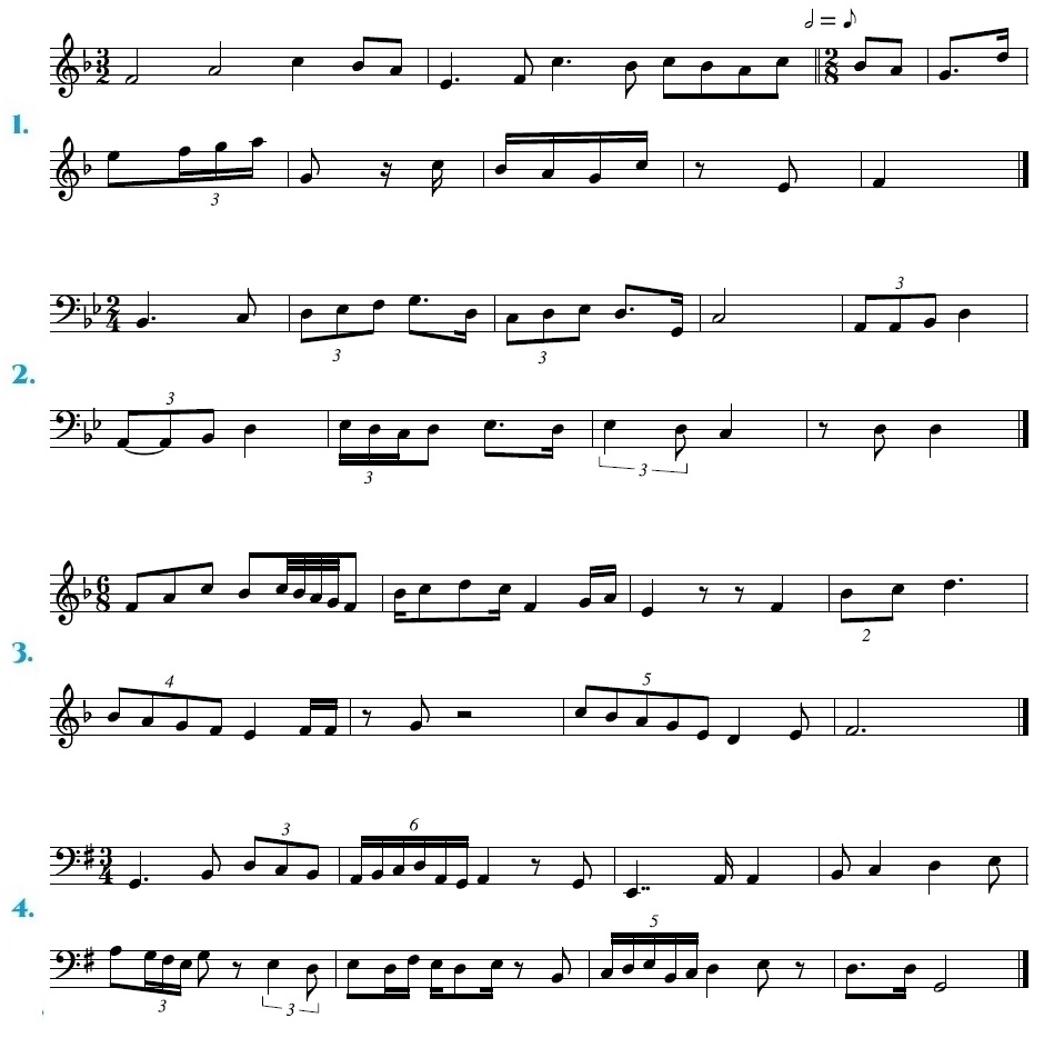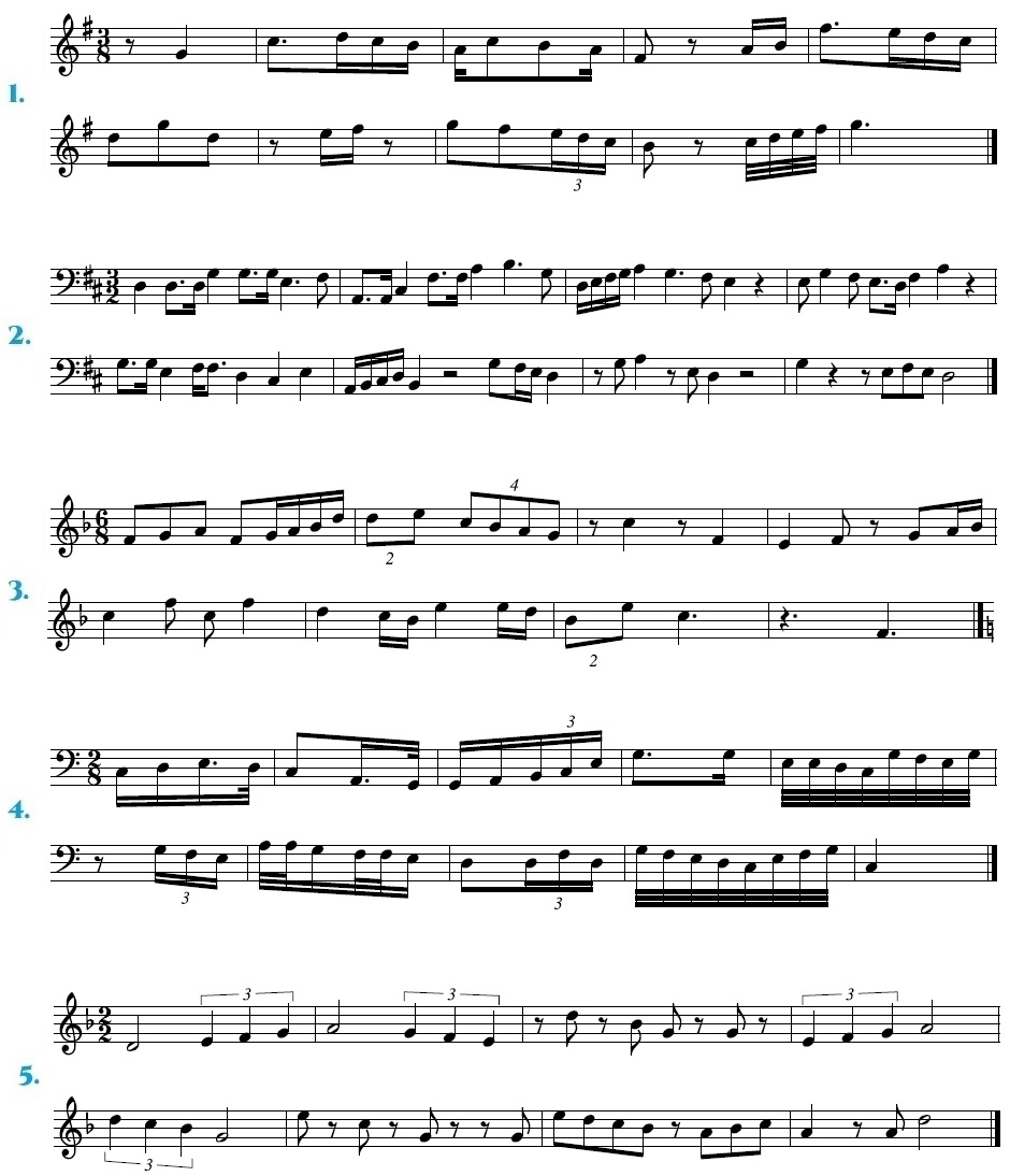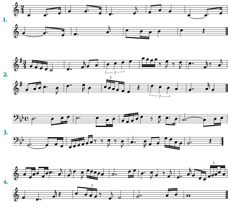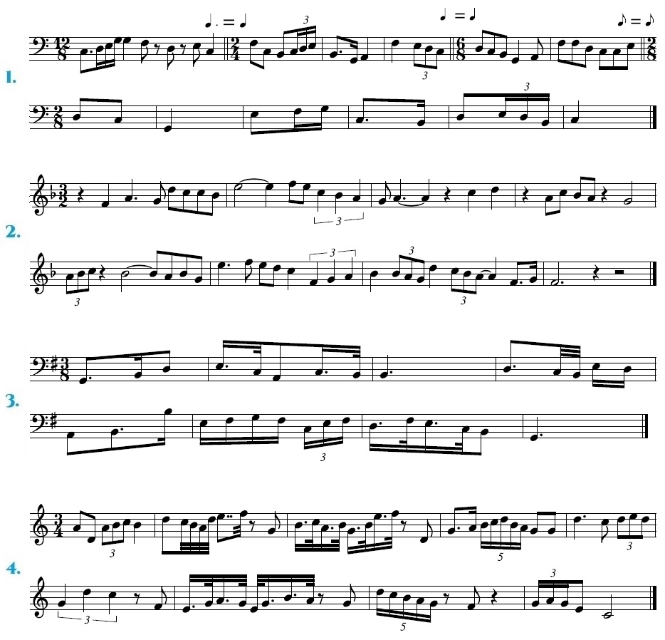 Comezamos con exercicios con dobre puntiño e despois co síncope dobre, e por último ambos, nas claves de Sol e Fa. Tamén repasaremos todo o traballado ata agora. Os exercicios van aumentando de dificultade. Practicádeos nesa orde.