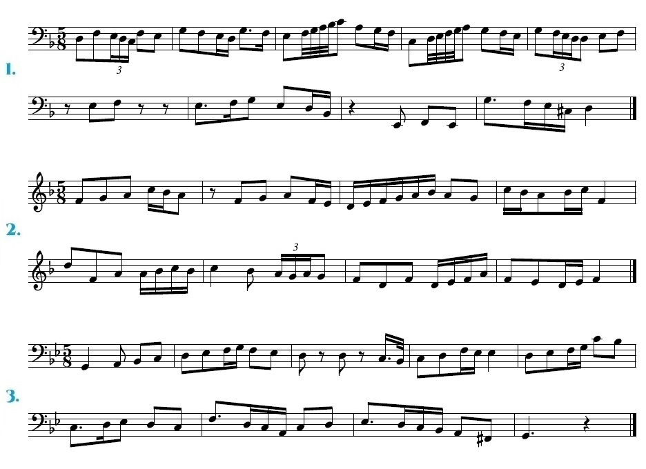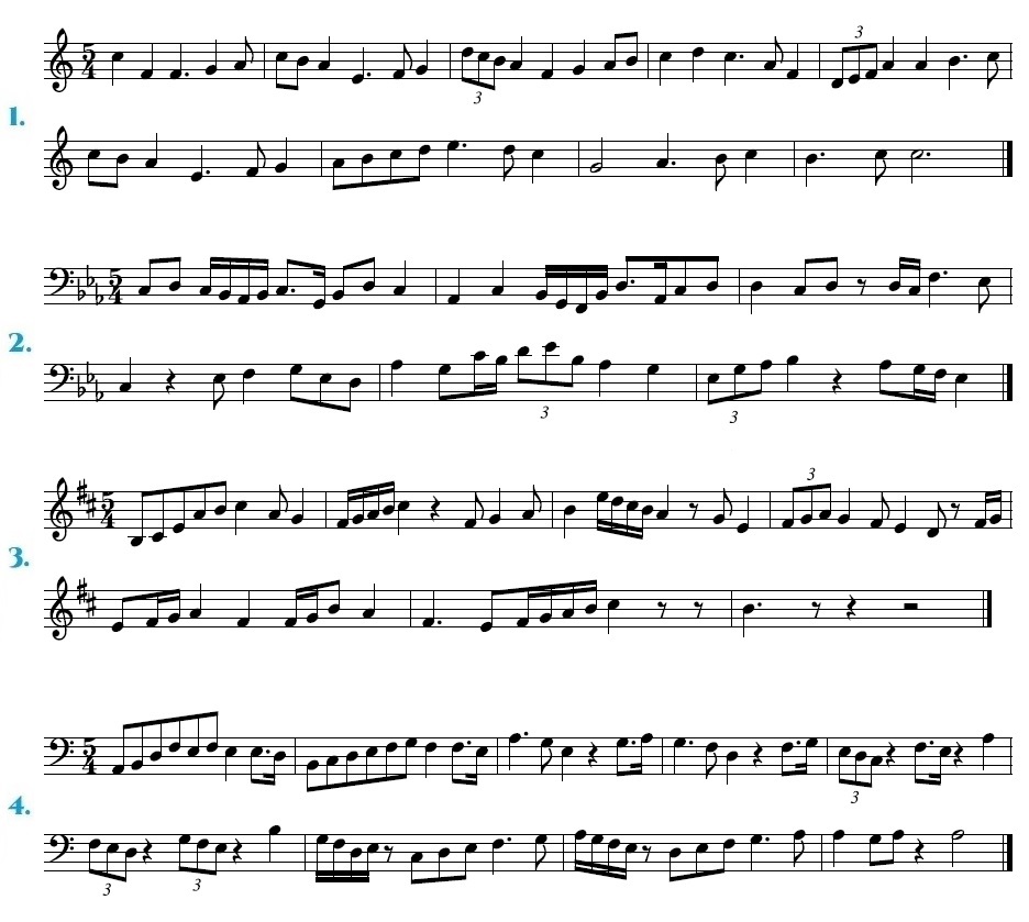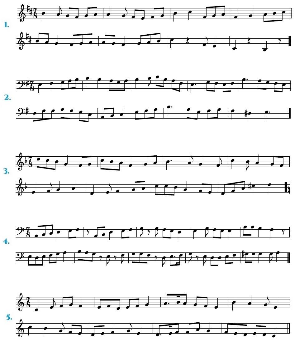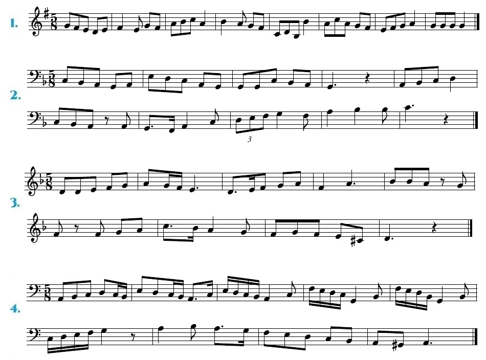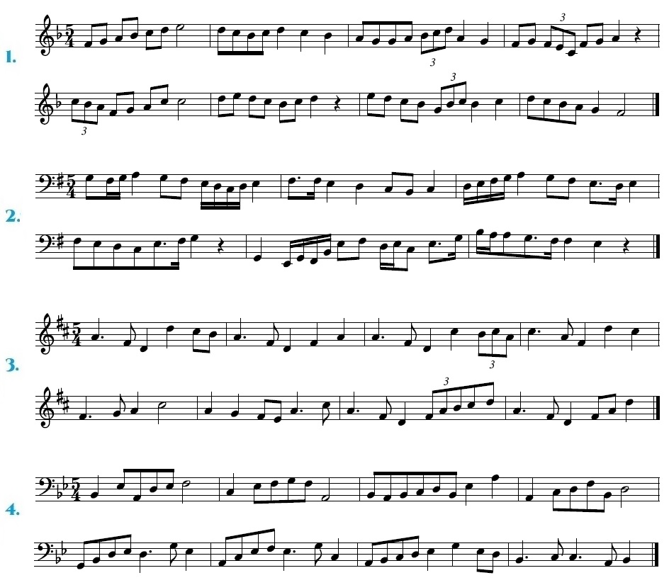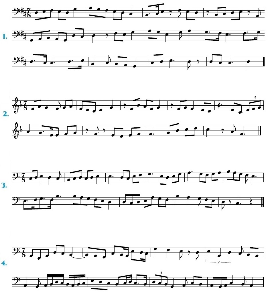 Comezamos con exercicios en 5/4, seguimos co 5/8 e rematamos co 7/8, nas claves de Sol e Fa. Tamén repasaremos todo o traballado ata agora. Os exercicios van aumentando de dificultade. Practicádeos nesa orde.