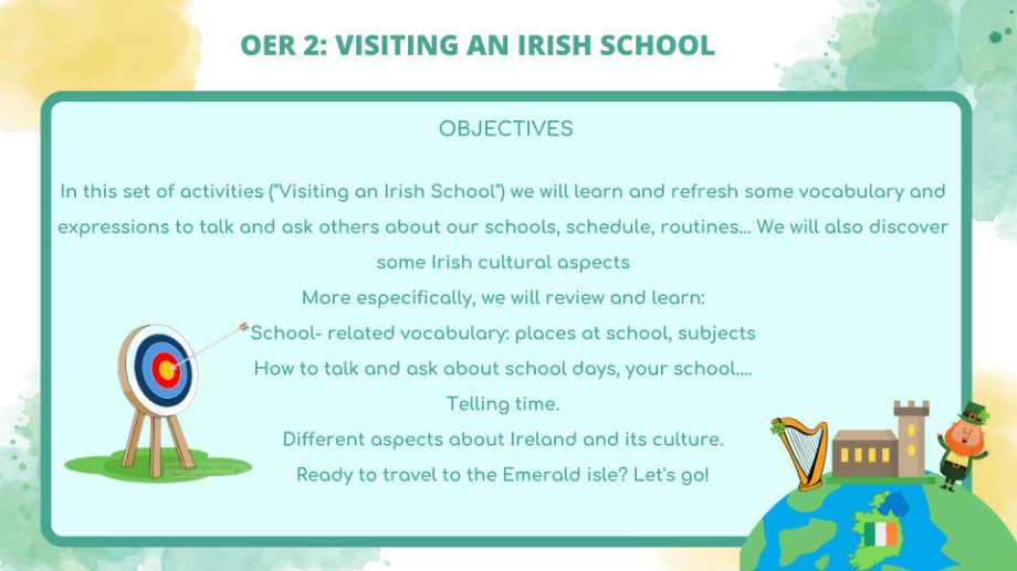 In this OER we will be travelling to IRELAND, the Emerald Isle. We will visit an Irish school and learn a few things about their culture.
