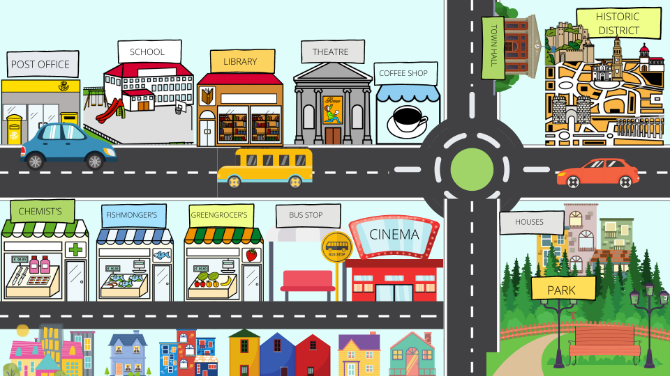 Now design a big town map on the floor (classroom/playground...) and pretend to ask and get directions to get to different places.